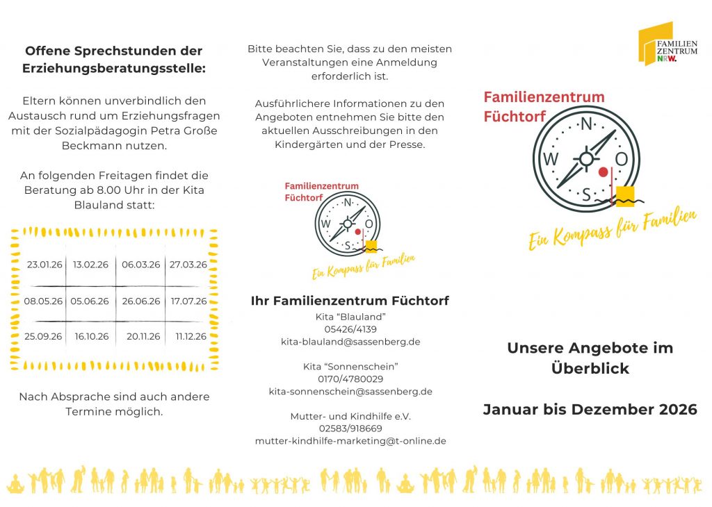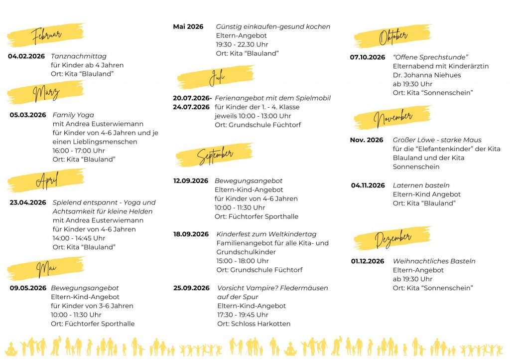 Auch in diesem Jahr hat das Familienzentrum Füchtorf wieder viele tolle Veranstaltungen für Kinder und Familien im Programm. Nähere Informationen sind den Aushängen im Familienzentrum bzw. der Tagespresse zu entnehmen.